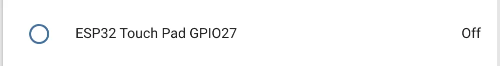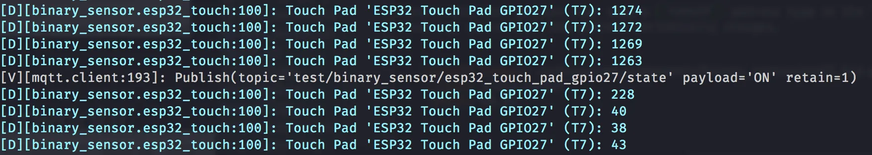 binary_sensor: - platform: esp32_touch name: "ESP32 Touch Pad GPIO27" pin: GPIO27 threshold: 1000Upload the program/configuration and watch the device’s logs; you’ll see values being logged by the hub component. Touching the sensor’s pins/pads should result in a (significant) change in the values being logged. Experiment with different amounts of force applied to the touch pad; a pattern should emerge, revealing a value that falls between “touched” and “not touched” which the binary sensor will then use to differentiate between the two states.
