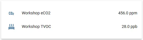 # Example configuration entrysensor: - platform: sgp30 # ... baseline: eco2_baseline: 0x86C5 tvoc_baseline: 0x8B38The next time you upload the code, the SGP30 will be continue its operation with this baseline and you will get consistent values.