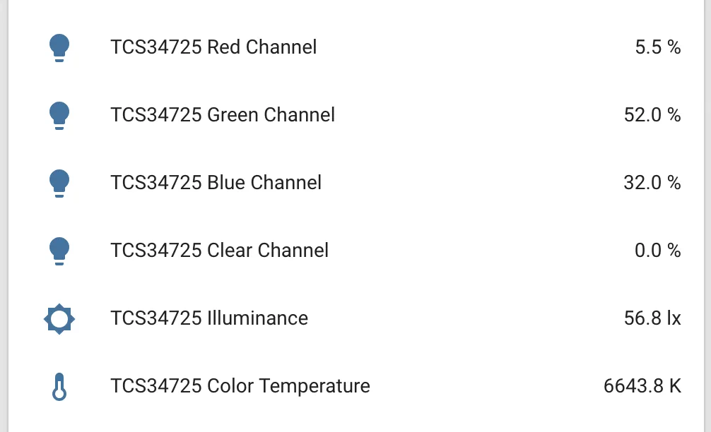 # Example configuration entrysensor: - platform: tcs34725 red_channel: name: "TCS34725 Red Channel" green_channel: name: "TCS34725 Green Channel" blue_channel: name: "TCS34725 Blue Channel" clear_channel: name: "TCS34725 Clear Channel" illuminance: name: "TCS34725 Illuminance" color_temperature: name: "TCS34725 Color Temperature" glass_attenuation_factor: 1.0 address: 0x29 update_interval: 60sConfiguration variables