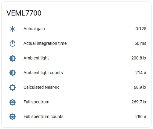 The veml7700 sensor platform allows you to use the Vishay VEML7700 and VEML6030 ambient light sensors with ESPHome.